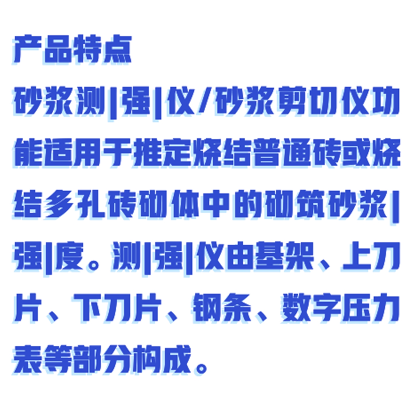 应用领域 GB/T50315-2011《砌体工程现场检验技术规程》 产品特点 本产品的功能适用于推定烧结普通砖或烧结多孔砖砌体中的砌筑砂浆强度。测强仪由基架、上刀片、下刀片、钢条、数字压力表等部分构成。测强仪具有结构、工作稳定、重量轻、简便快捷、度高等特点。 技术参数 测强仪大剪切力1.4kN 上下刀片刃口厚度1.8mm±0.02mm 上下刀片中心间距2.2mm±0.05mm 刀片行程50mm
